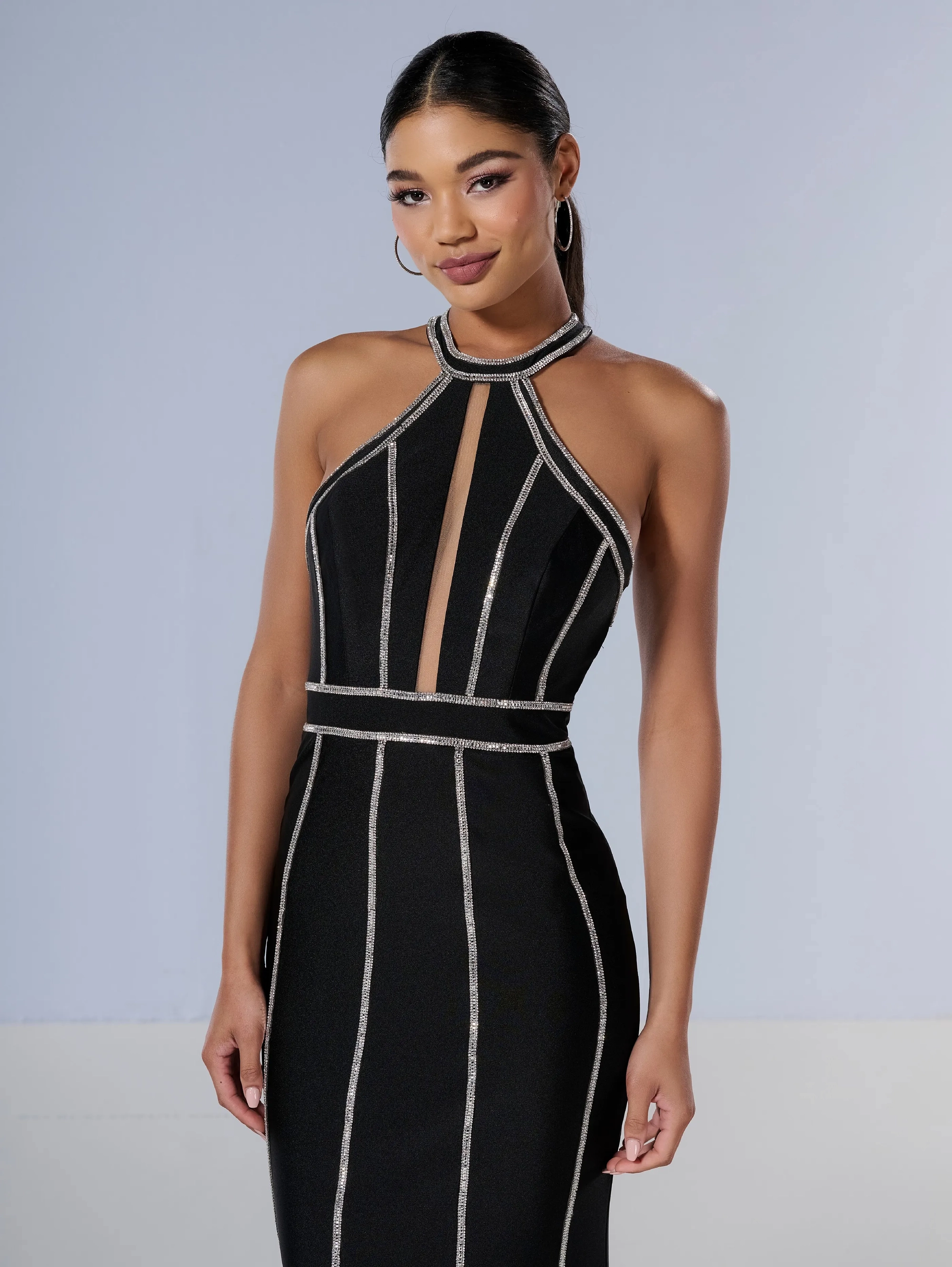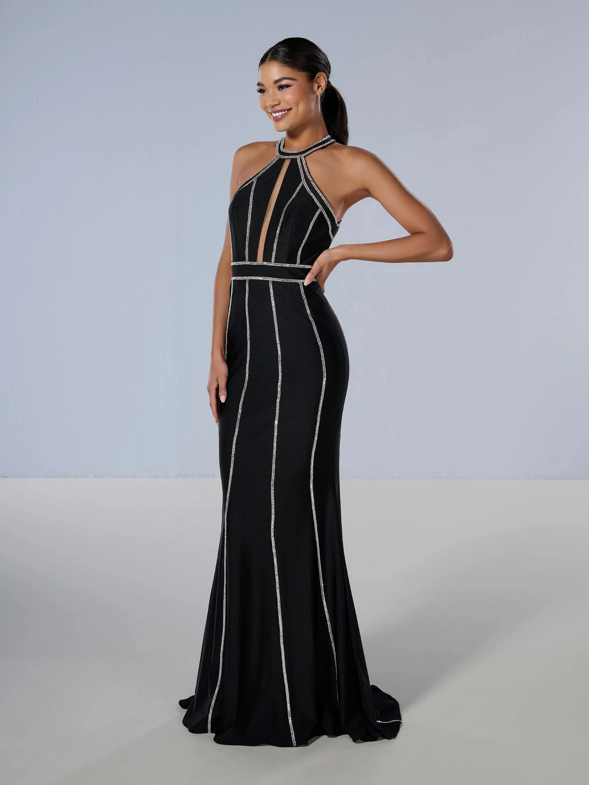A flawless fit and flare gown made out of a jersey material with a halter neckline.