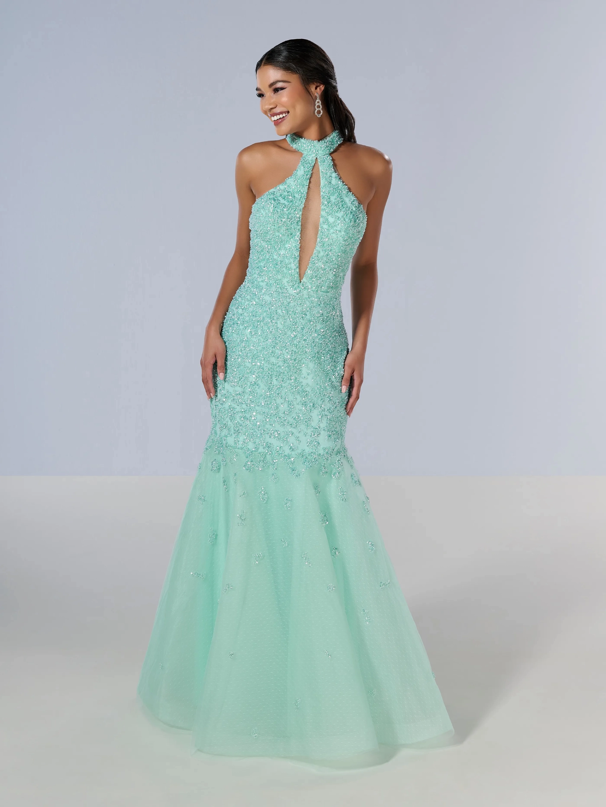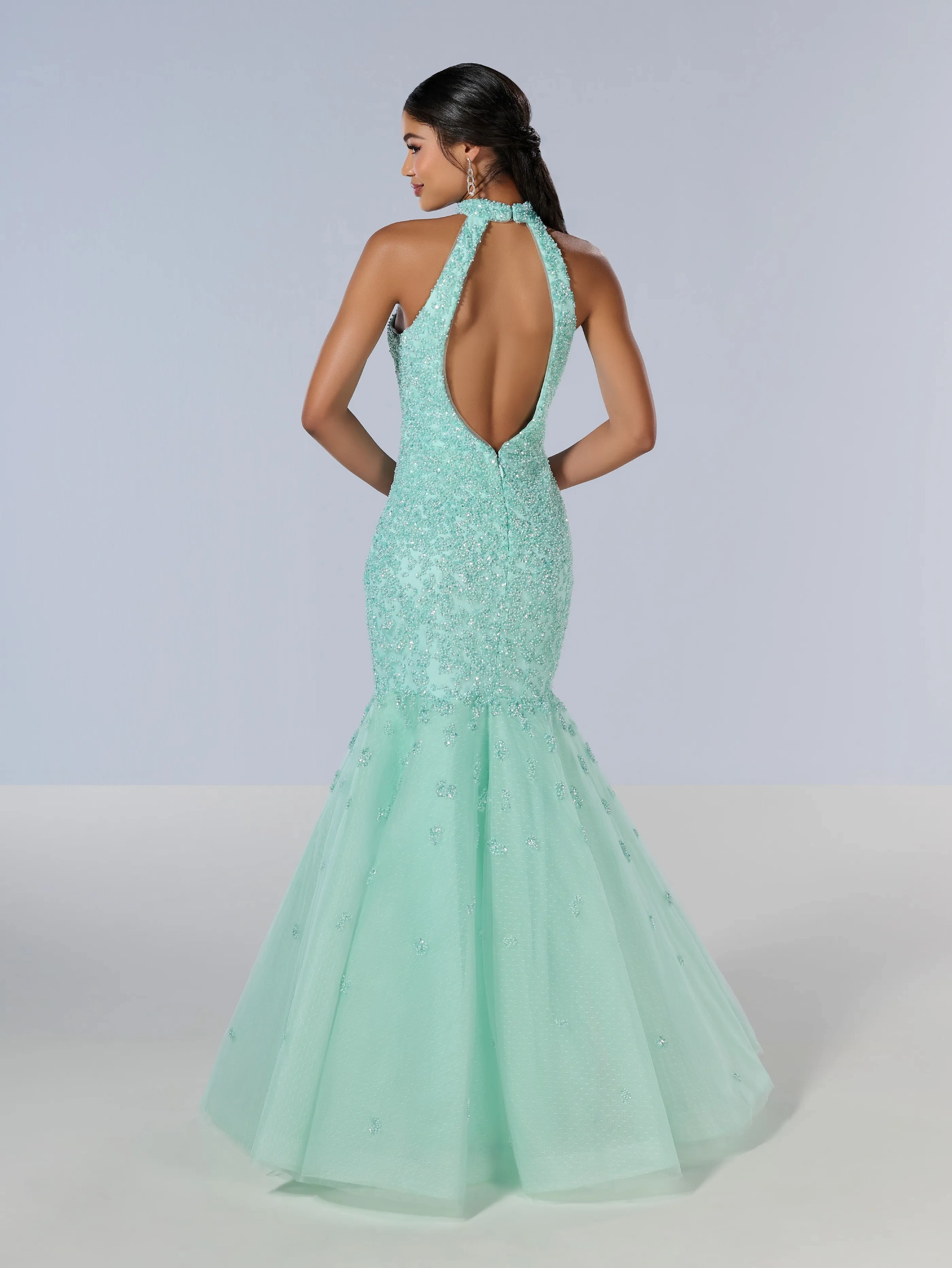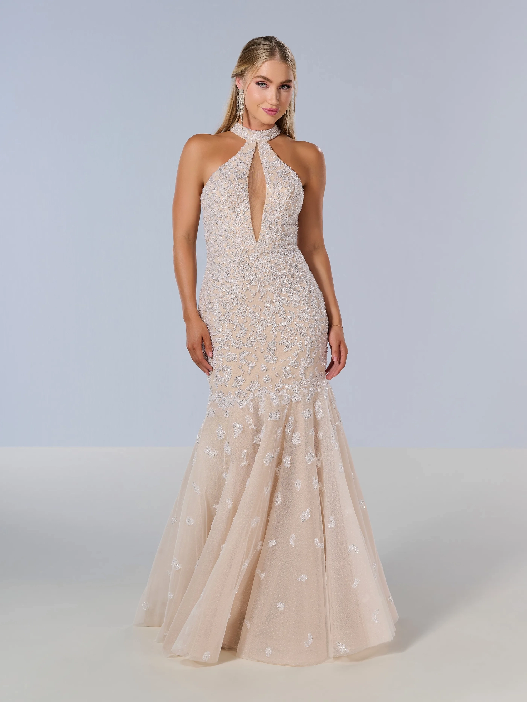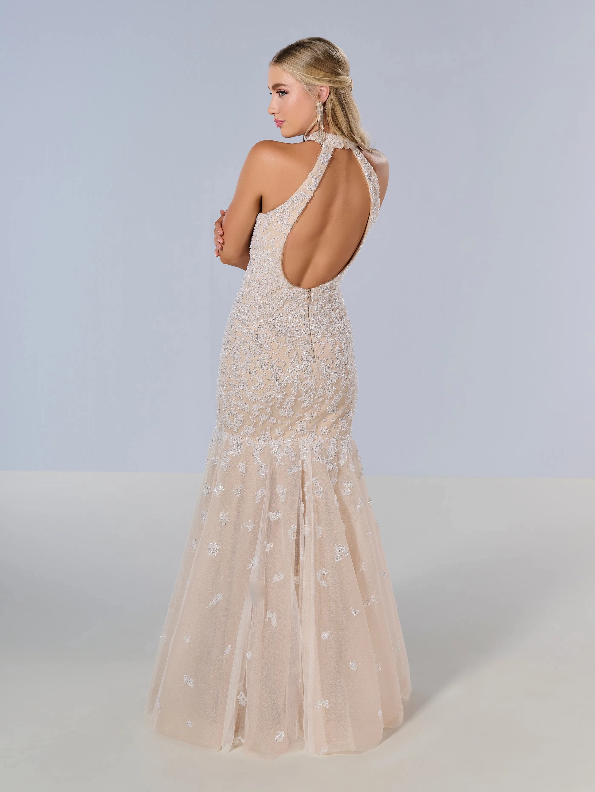 A mermaid base gown made out of beaded tulle fabric with a halter neckline.