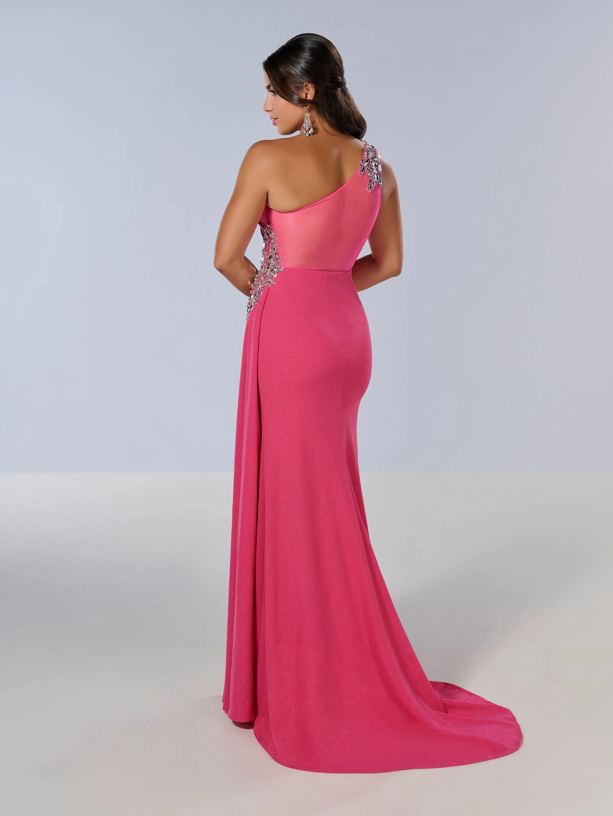 A trumpet fitted gown made out of spandex material with a one shoulder top.