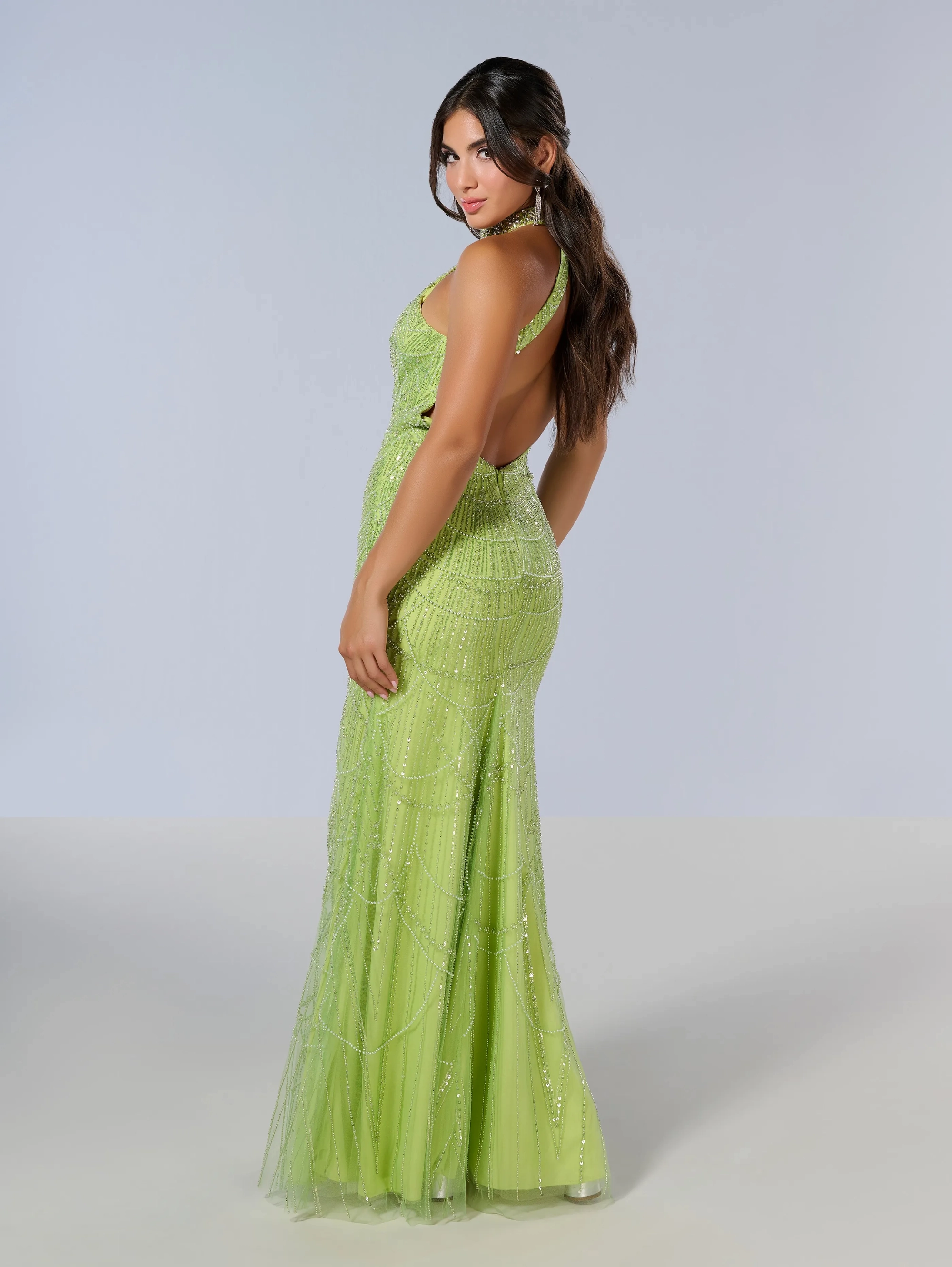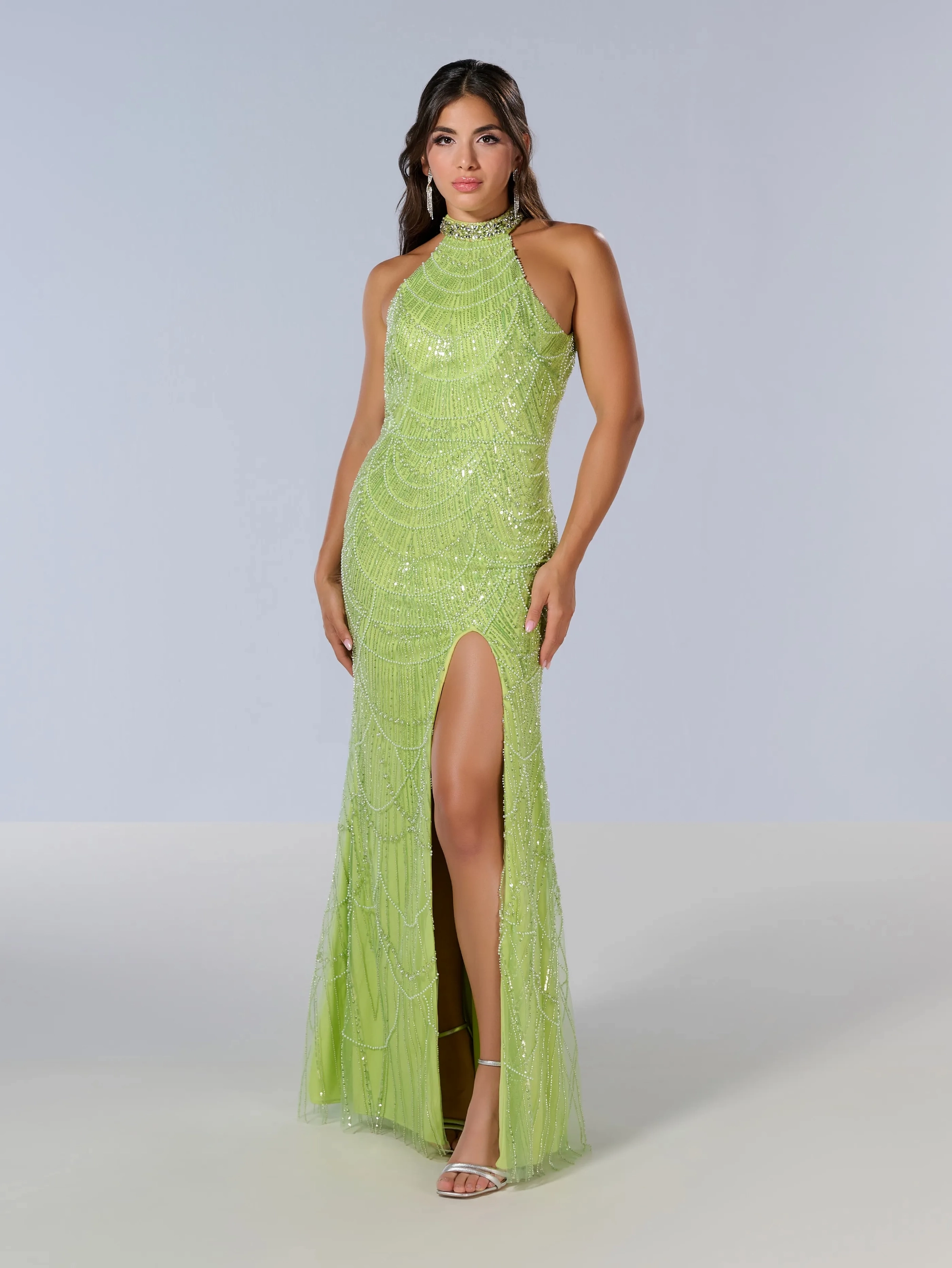 This dazzling gown combines intricate beaded tulle with a flattering fit-and-flare silhouette, accentuated by a halter neckline that exudes both elegance and modern charm.