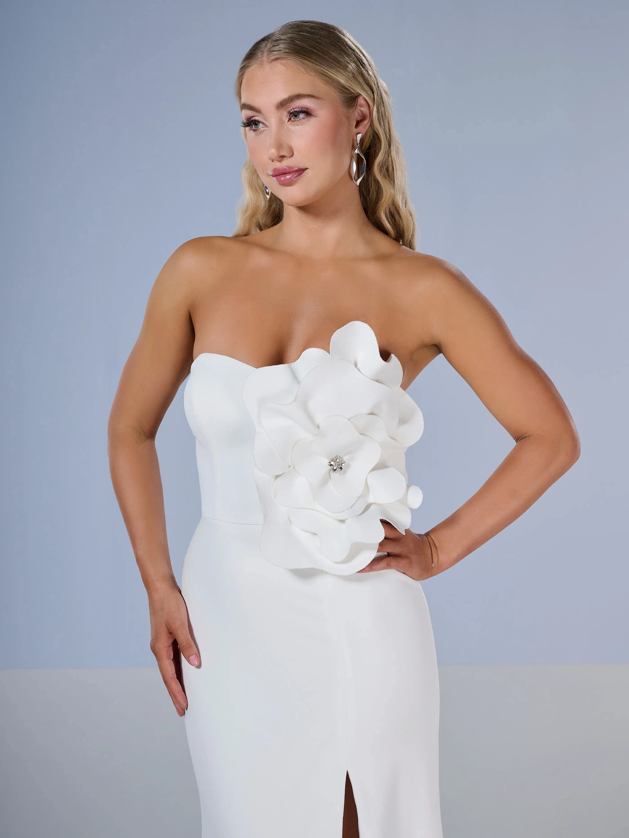 Slim crepe sheath with a statement self fabric 3d floral.