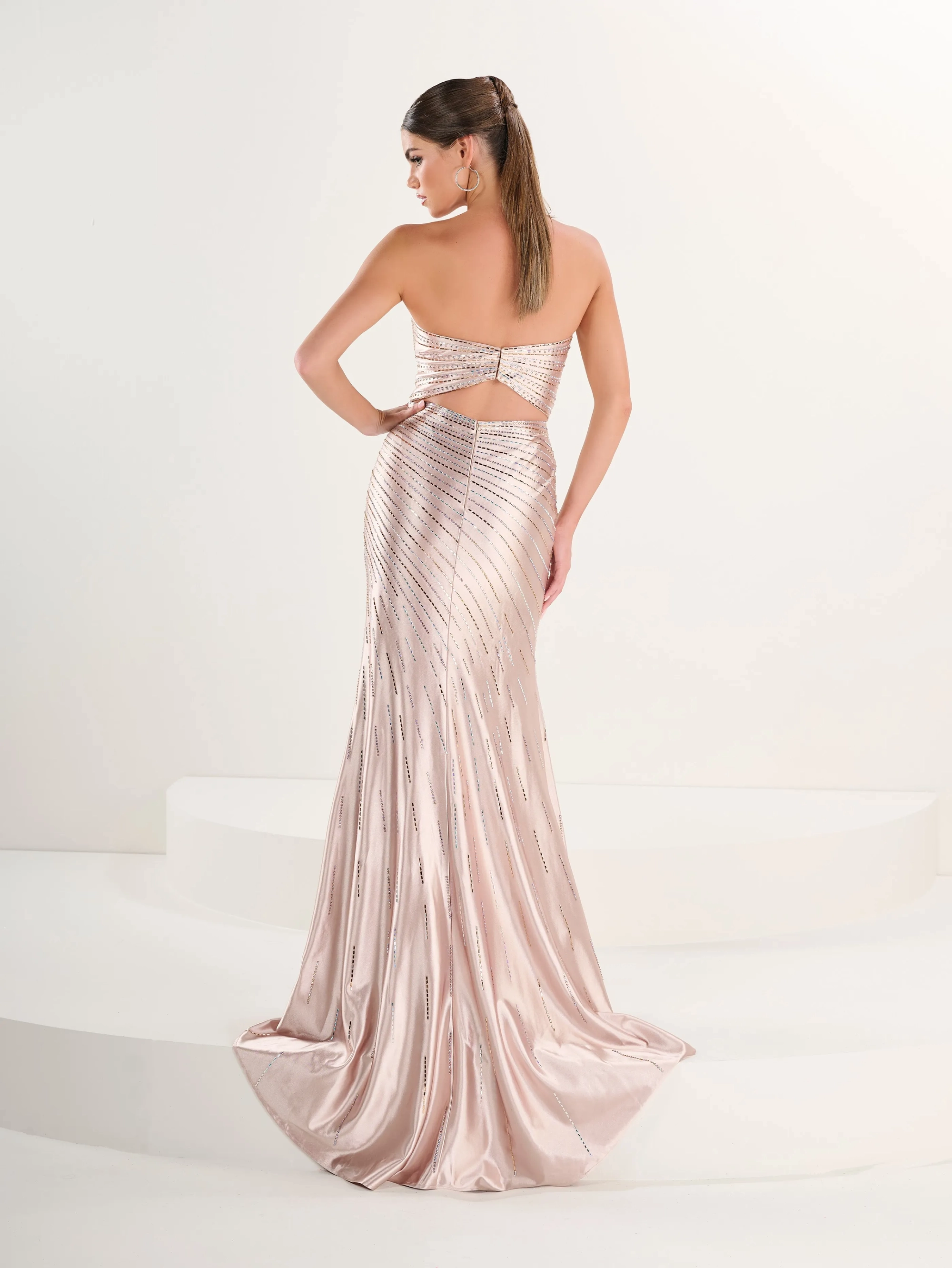 Strapless foil jersey sheath with linear heatset crystals.