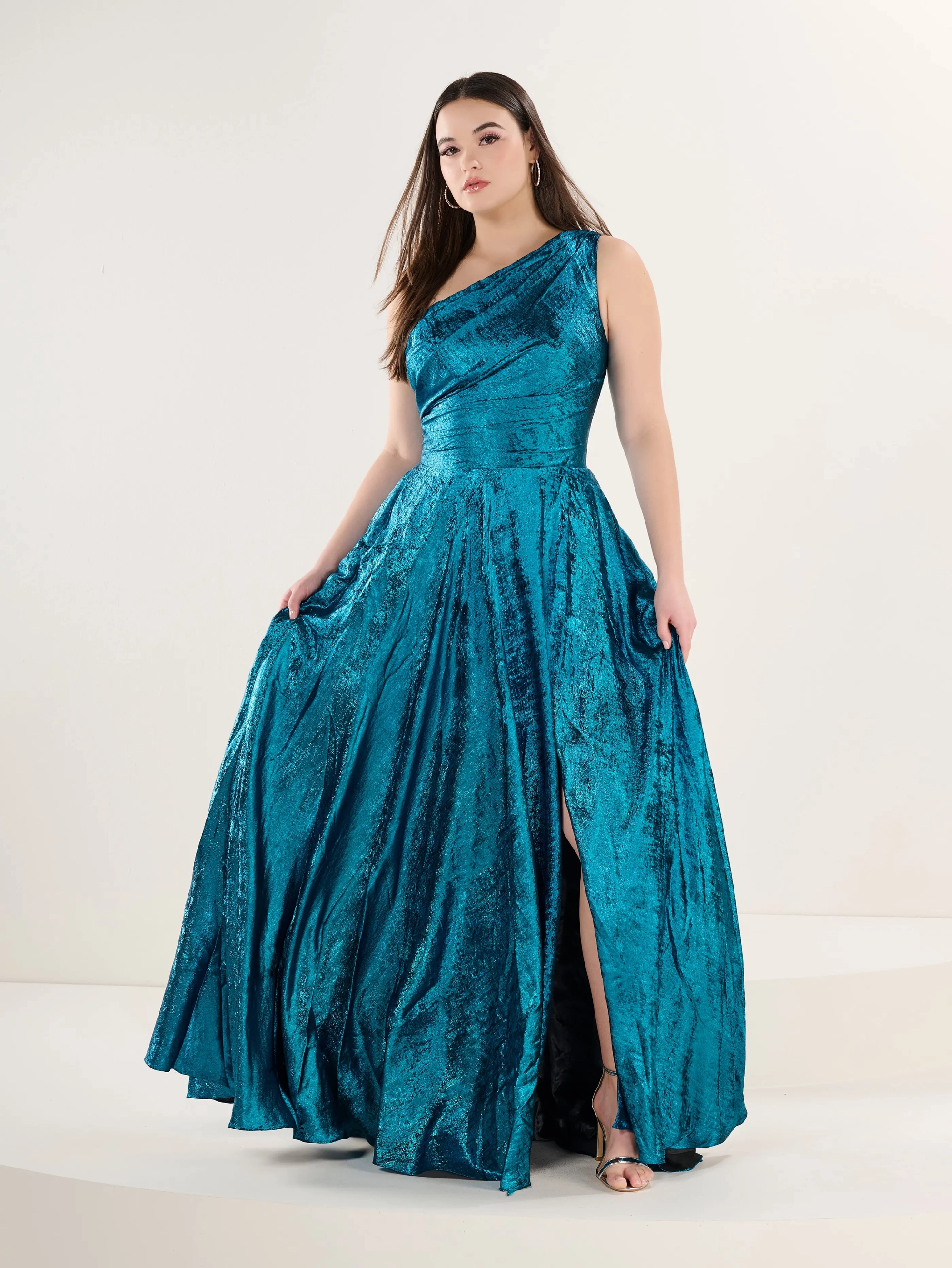 Be red-carpet ready in this silky lame gown with a lightly ruched bodice featuring a one shoulder neckline.