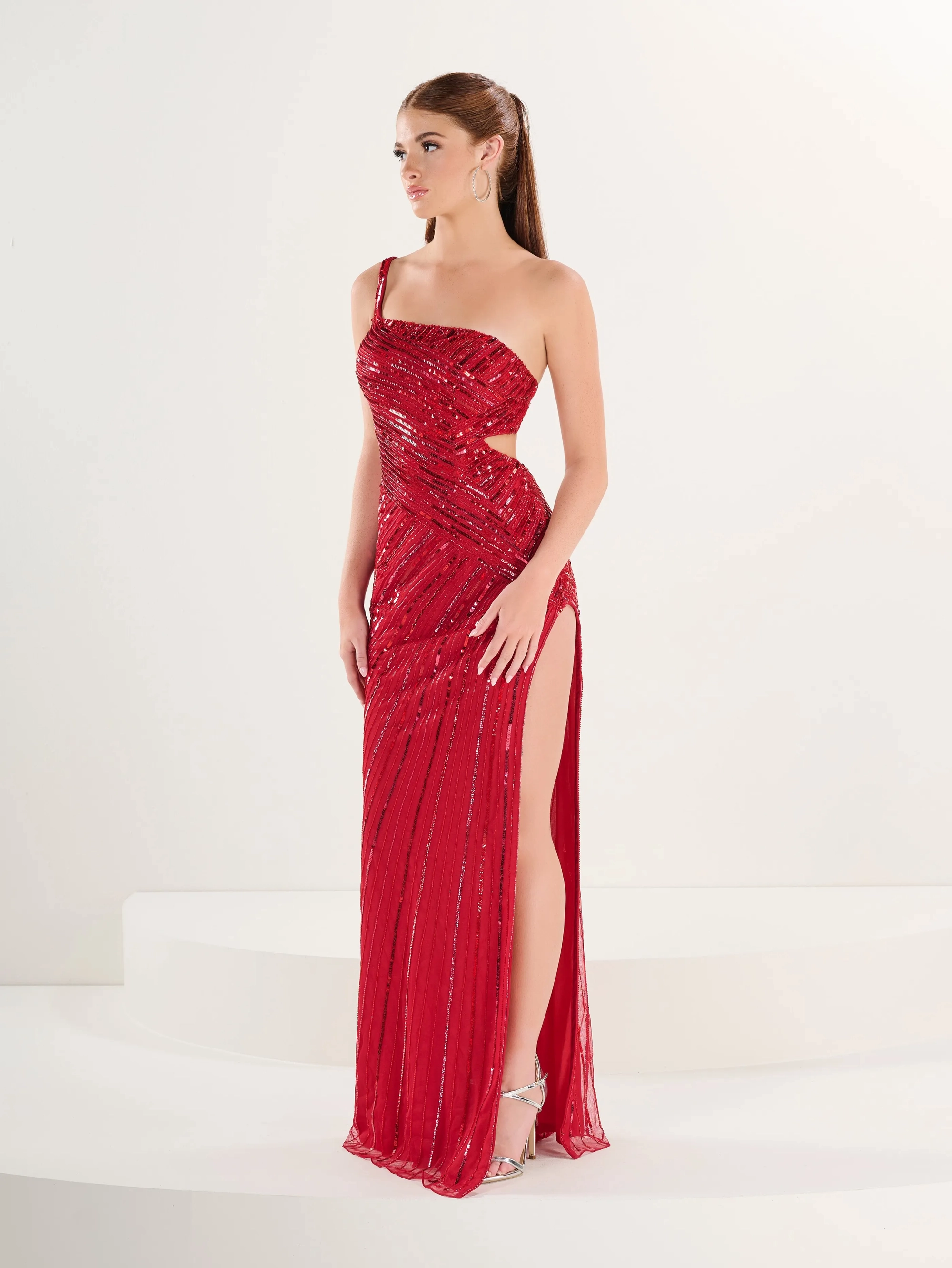 Dancing queen linear beaded one shoulder gown with open sides/back.